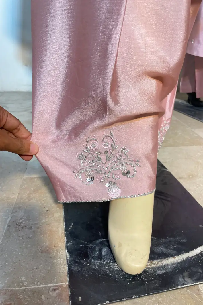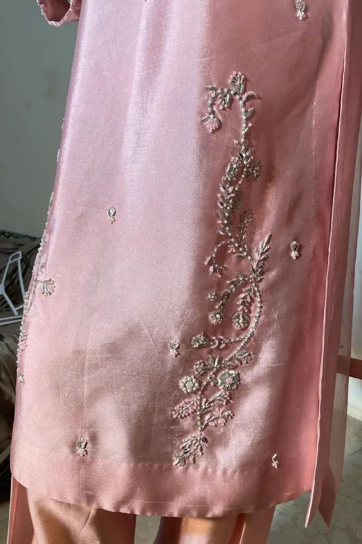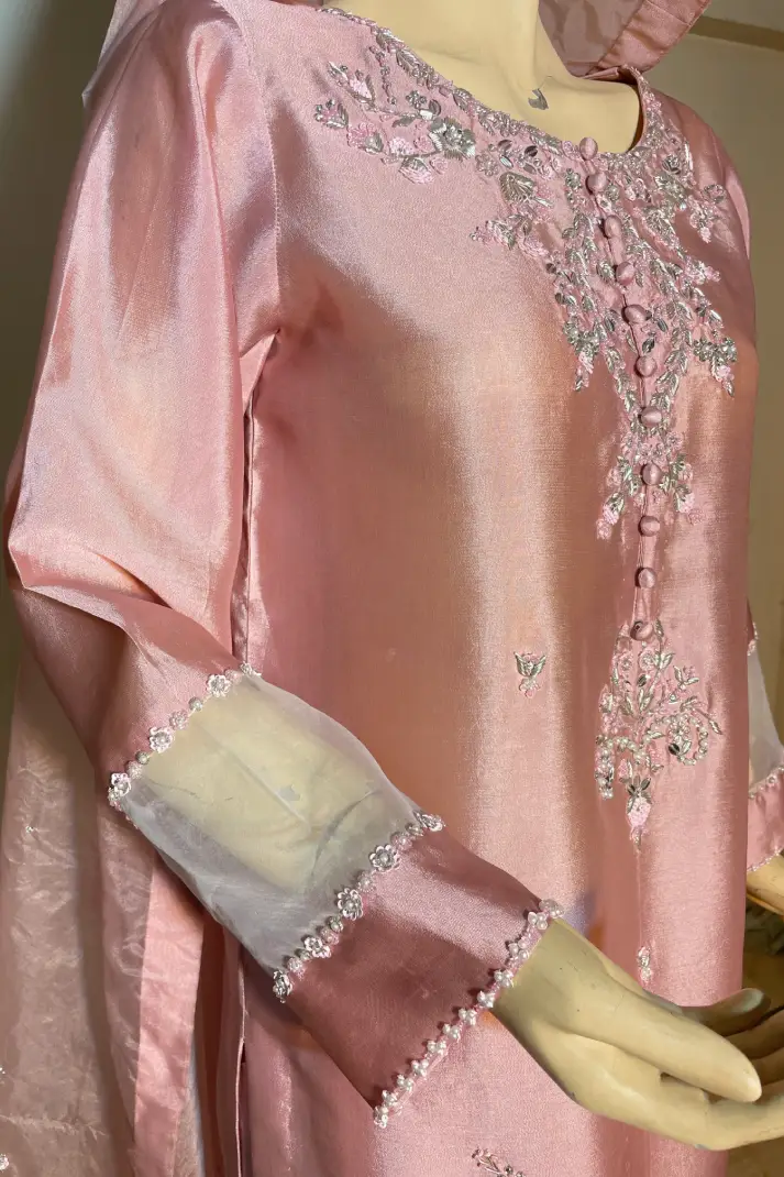 SKU: AZ-44 Color: Light Pink Fabric: Shirt and Shalwar: Pure Shisha Silk, Dupatta: Organza/Medium Silk/Chiffon Work Details: Embellished
