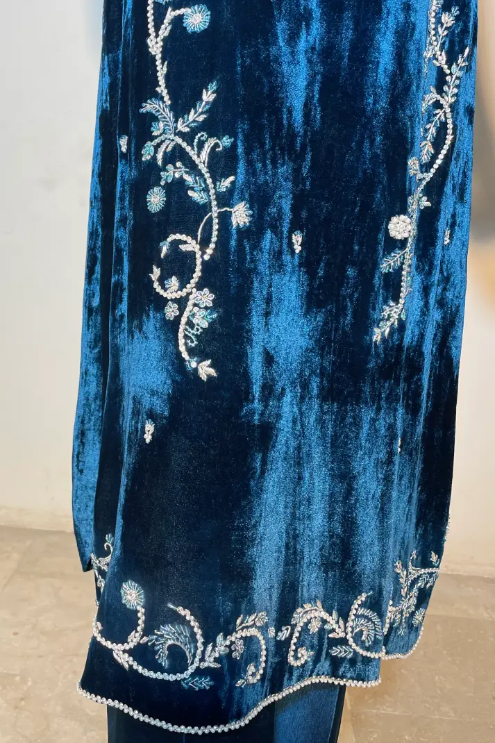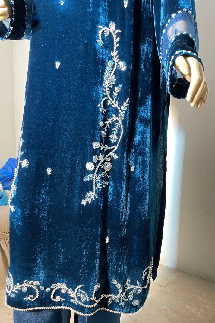 SKU: AZ-48 Color: Blue Fabric: Shirt: French Velvet, Shalwar: Pure Shisha Silk, Dupatta: Organza/Medium Silk/Chiffon Work Details: Embellished