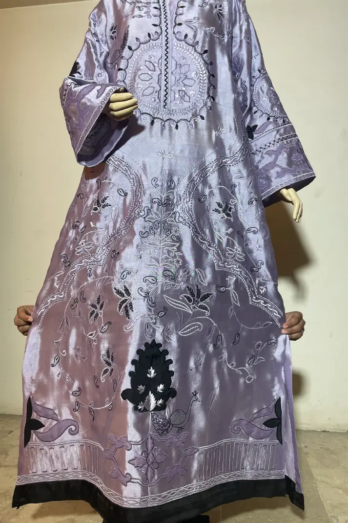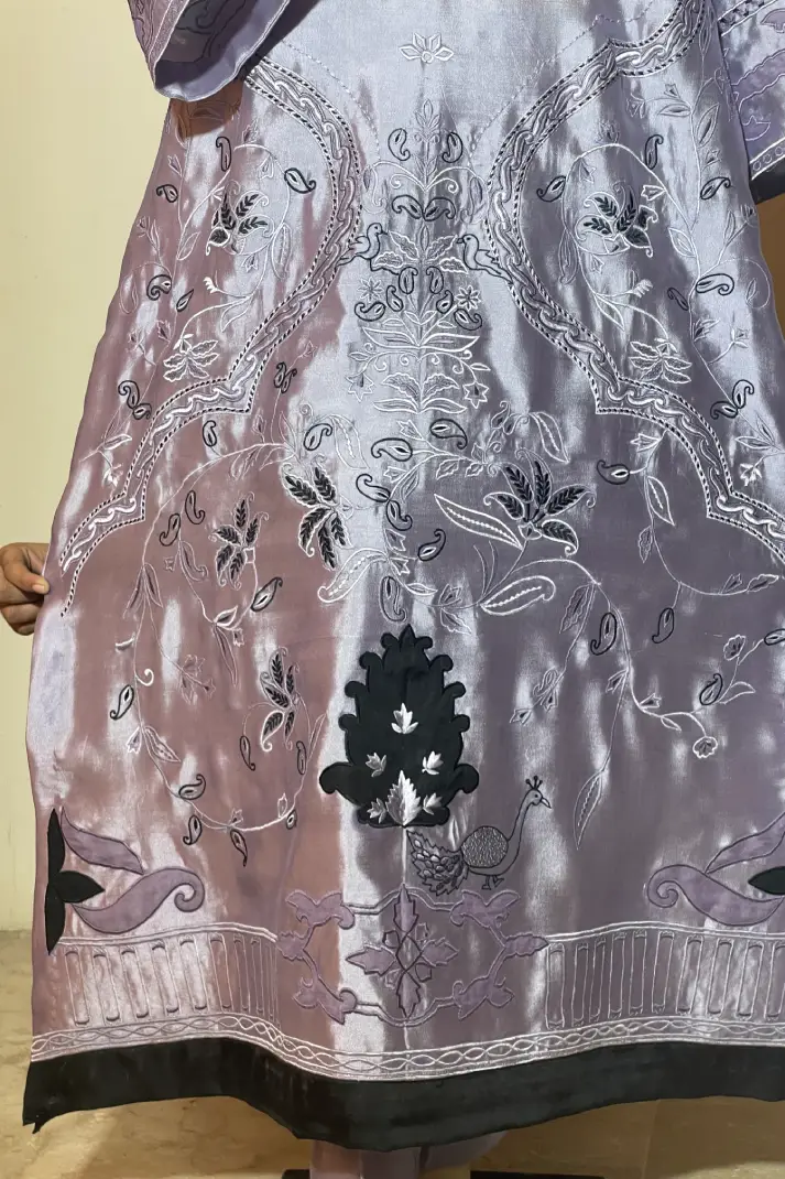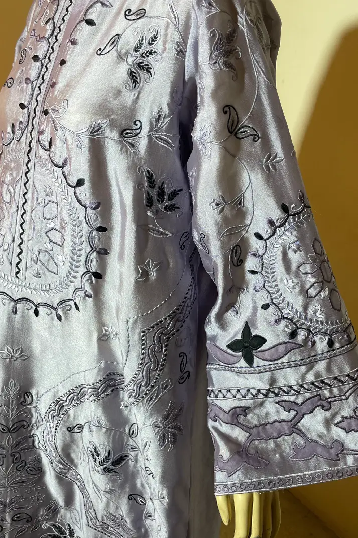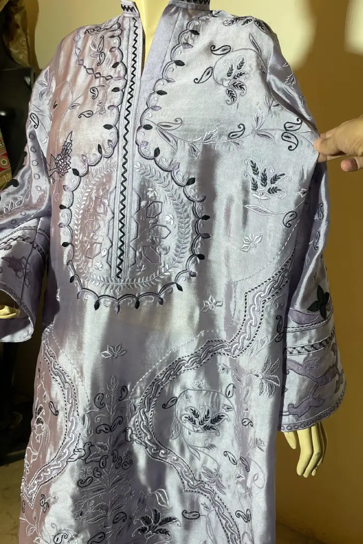 SKU: AZ-53 Color: Light Lavender Fabric: Shirt and Shalwar: Pure Shisha Silk, Dupatta: Organza/Medium Silk/Chiffon Work Details: Embroidered