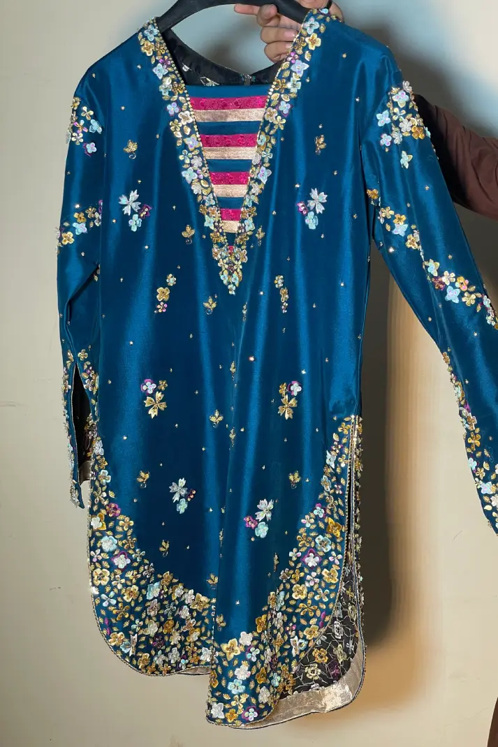 SKU: AZ-54 Color: Peacock Blue Fabric: Shirt and Shalwar: Pure Shisha Silk, Dupatta: Organza/Medium Silk/Chiffon Work Details: Embroidered and Embellished