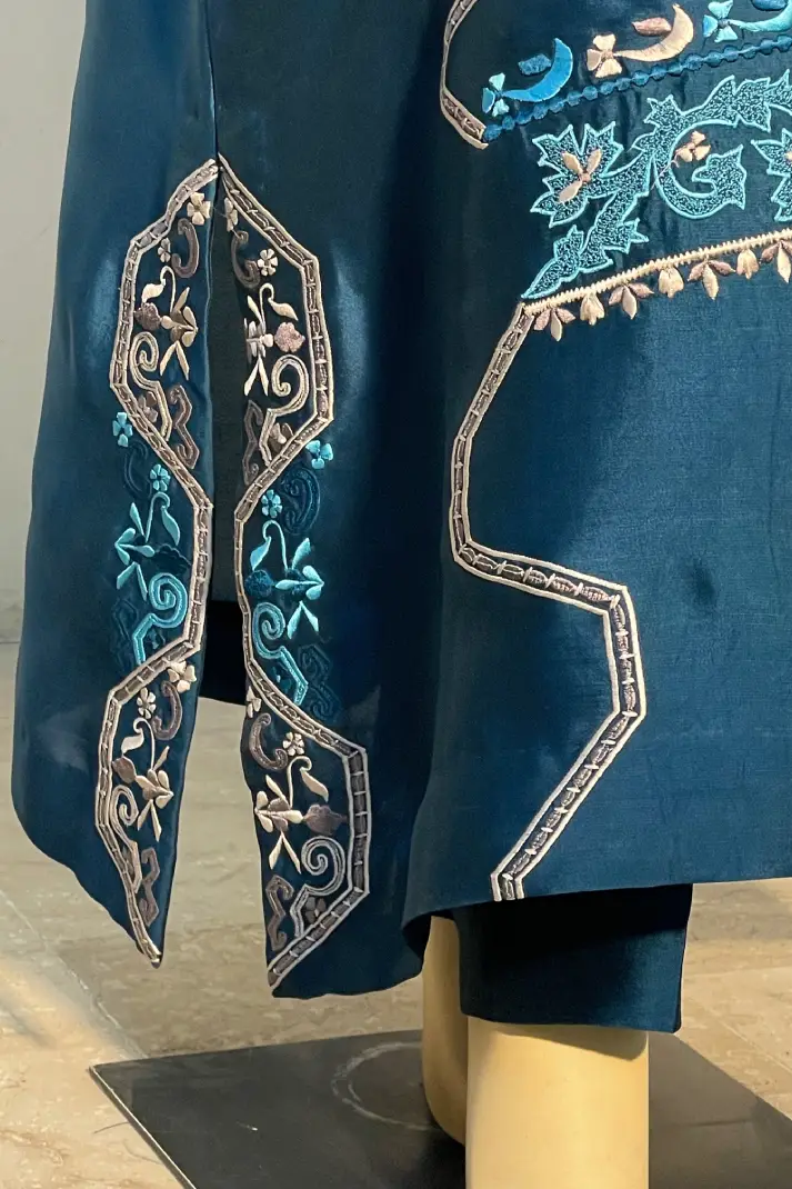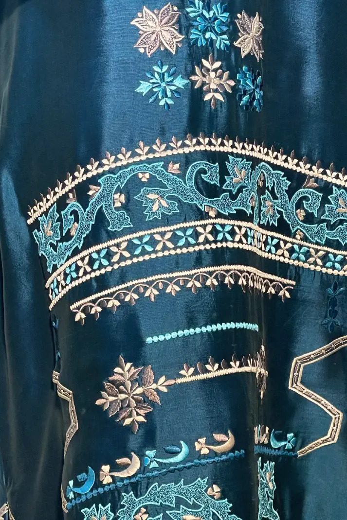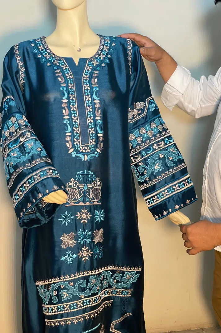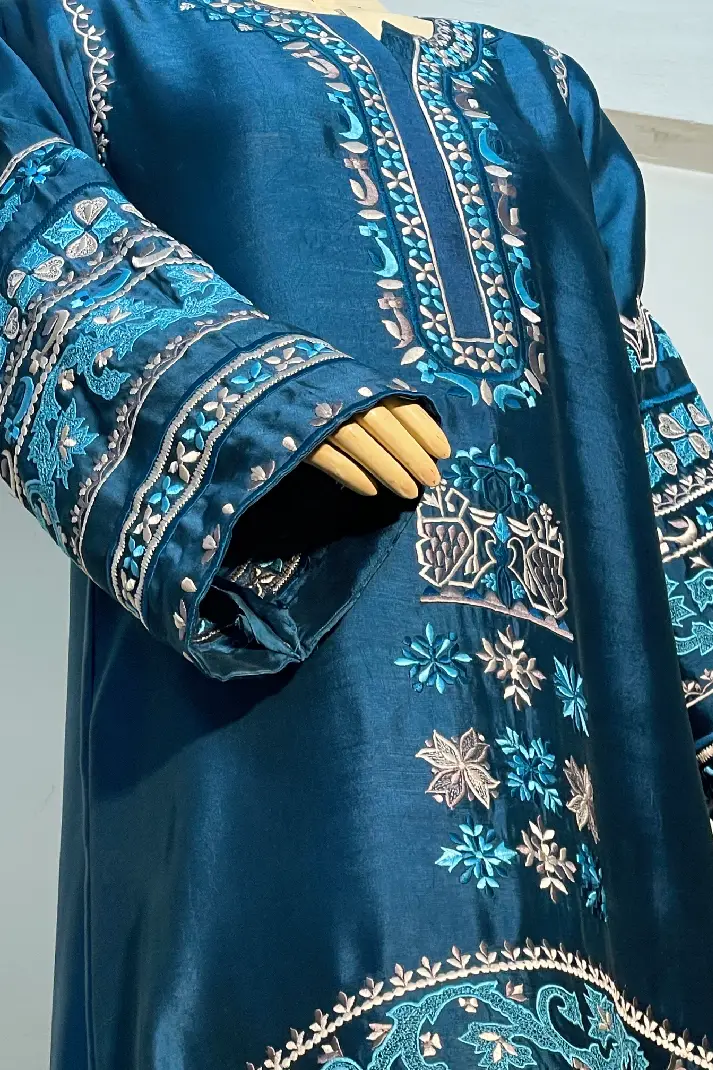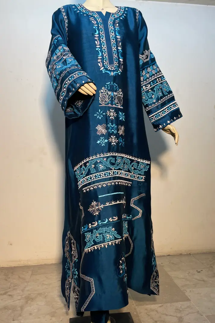 SKU: AZ-55 Color: Teal Blue Fabric: Shirt and Shalwar: Pure Shisha Silk, Dupatta: Organza/Medium Silk/Chiffon Work Details: Embroidered