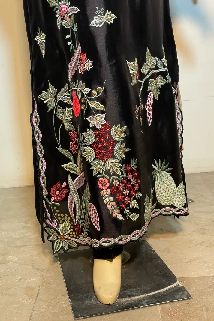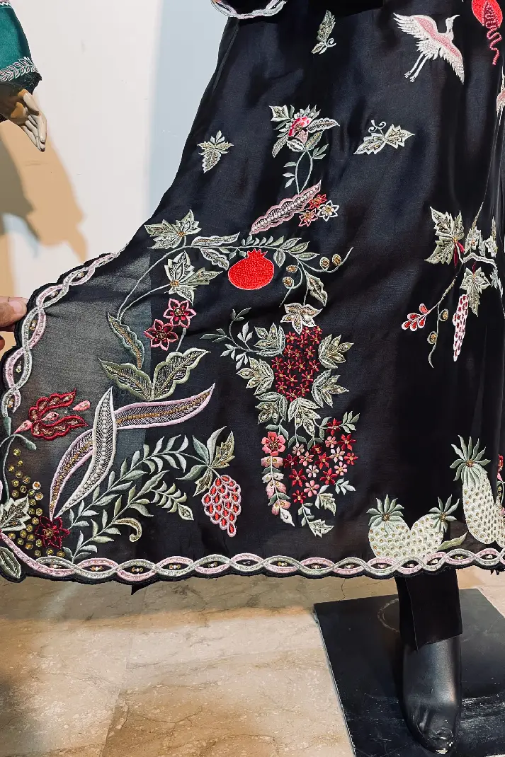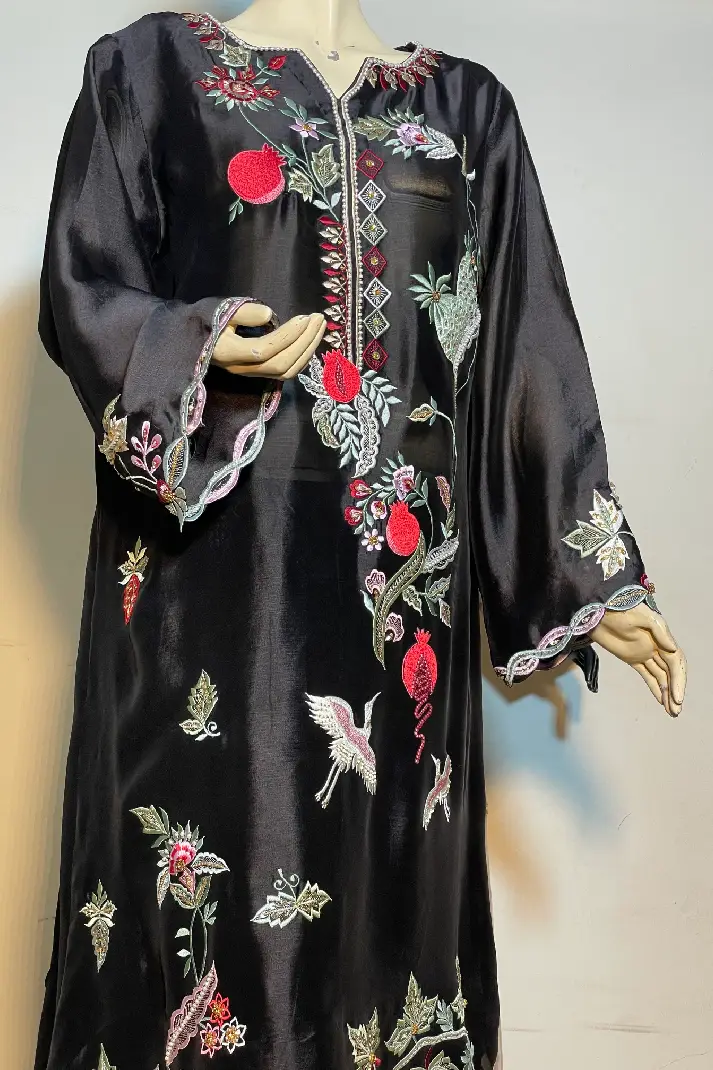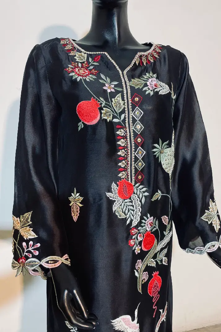 SKU: AZ-56 Color: Black Fabric: Shirt and Shalwar: Pure Shisha Silk, Dupatta: Organza/Medium Silk/Chiffon Work Details: Embroidered and Embellished