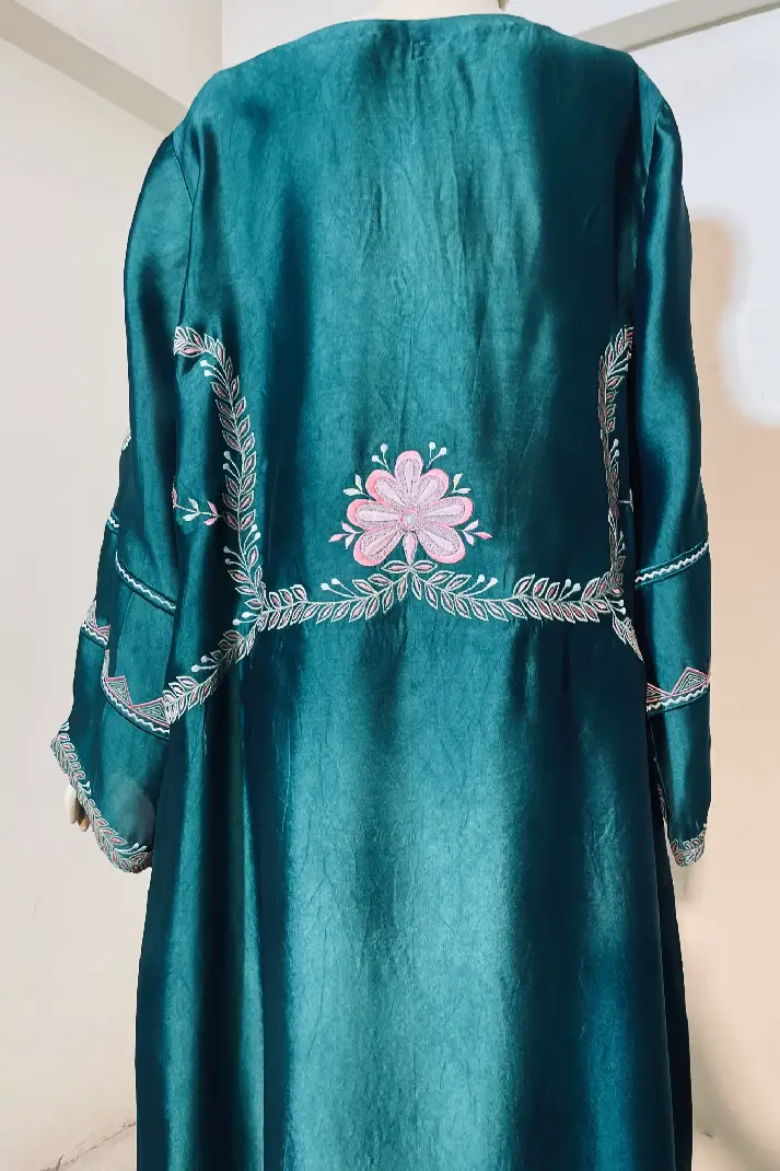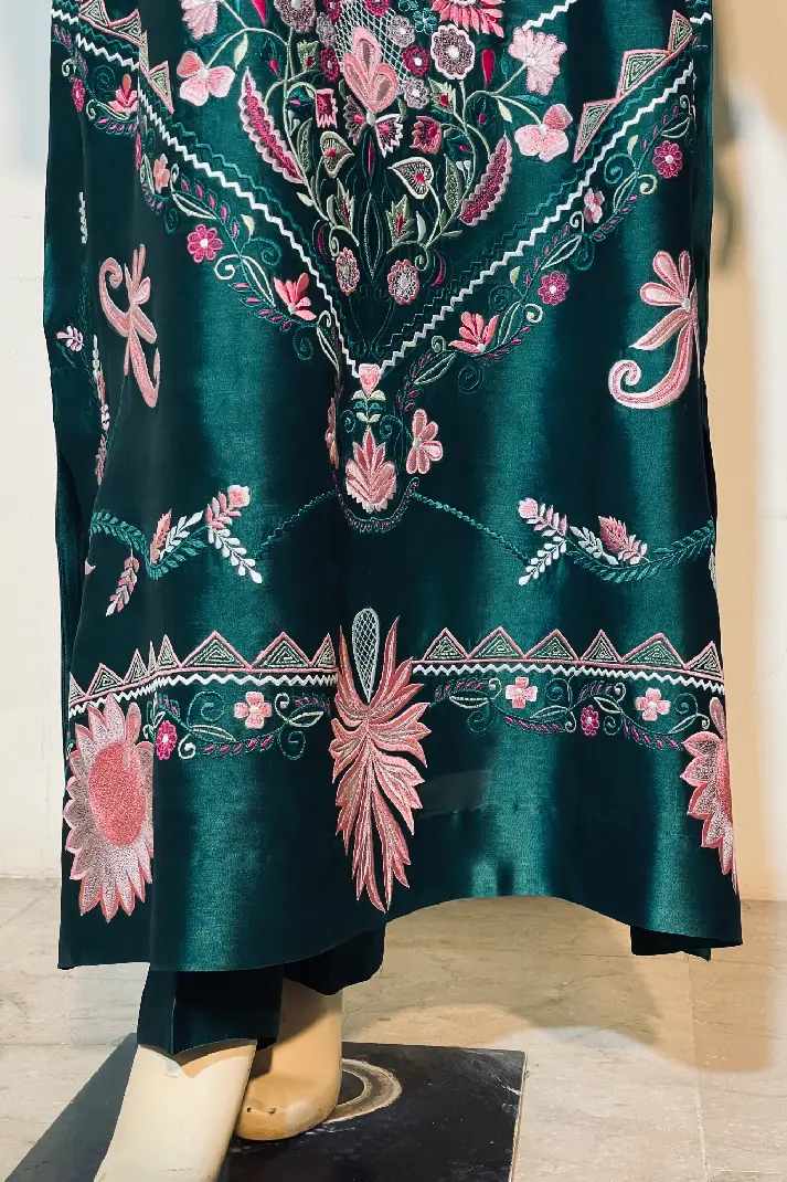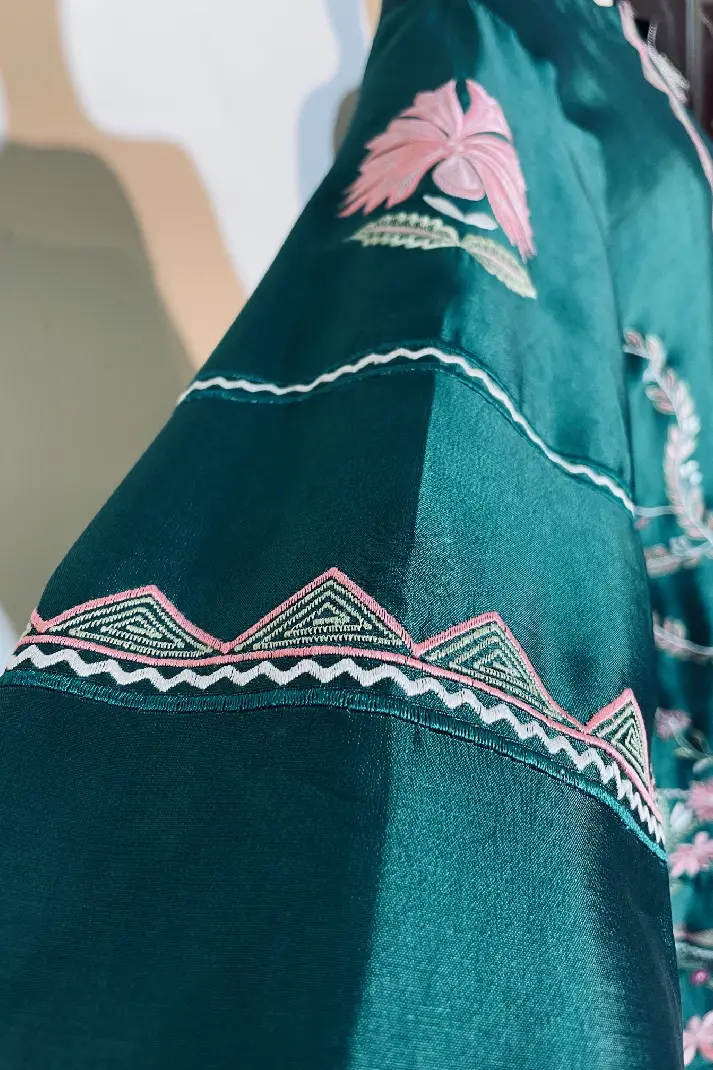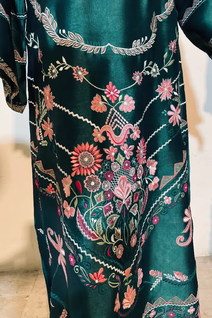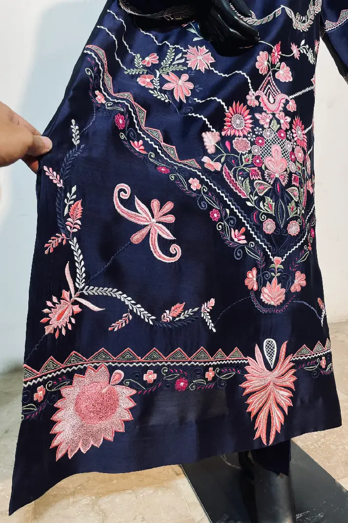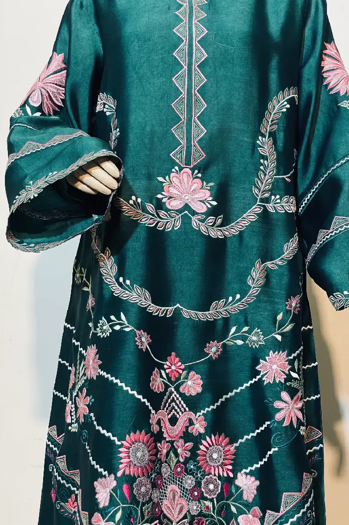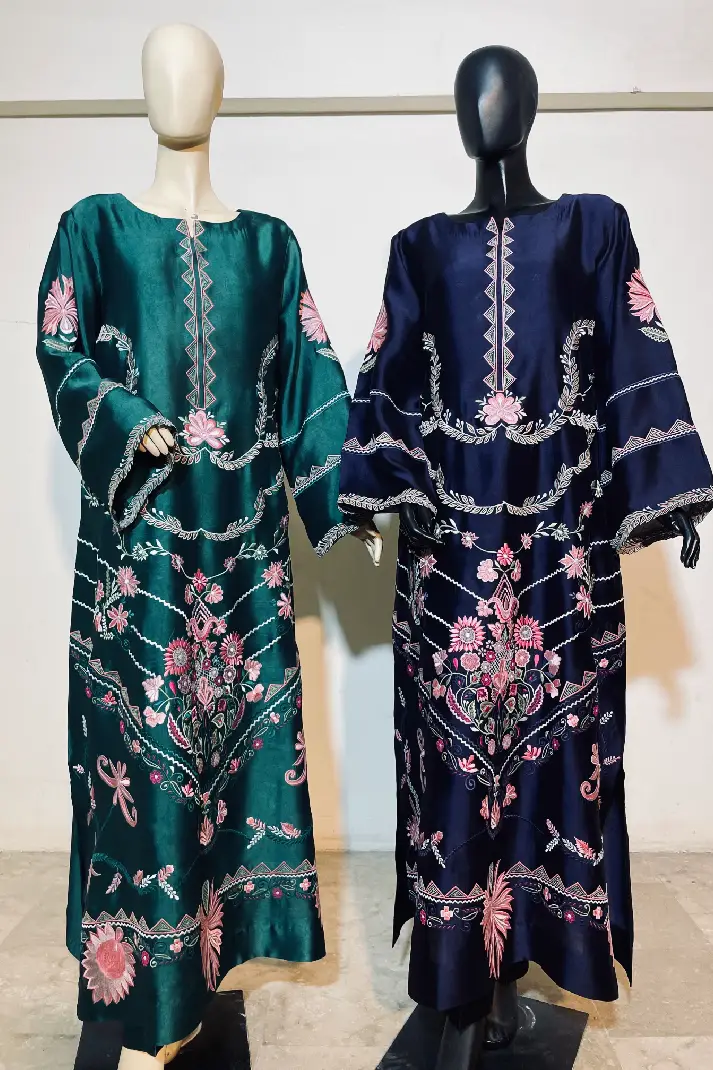 SKU: AZ-59 Color: Midnight Blue, Luna Green Fabric: Shirt and Shalwar: Pure Shisha Silk, Dupatta: Organza/Medium Silk/Chiffon Work Details: Embroidered