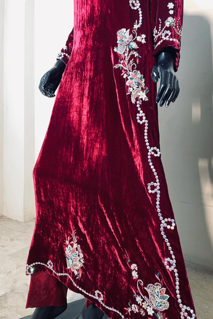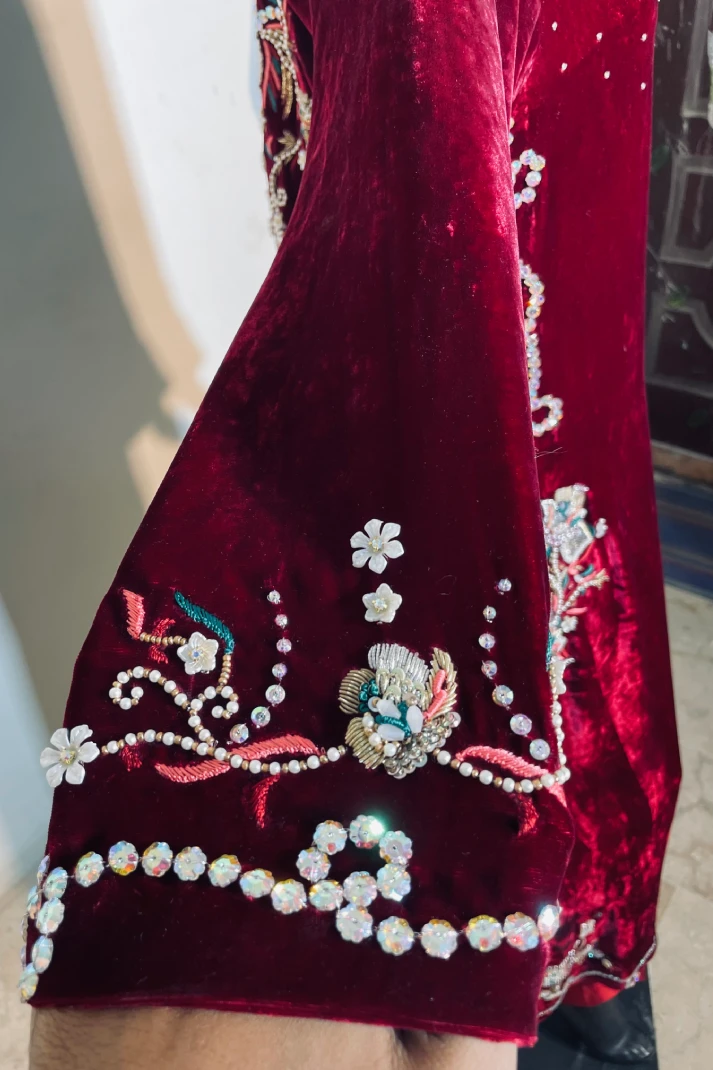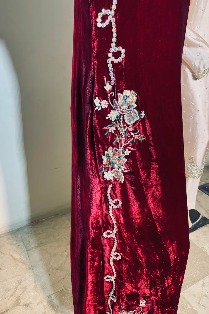 SKU: AZ-61 Color: Maroon Fabric: Shirt: Pure French Velvet, Pant: Shisha Silk, Dupatta: Organza Work Details: embellished
