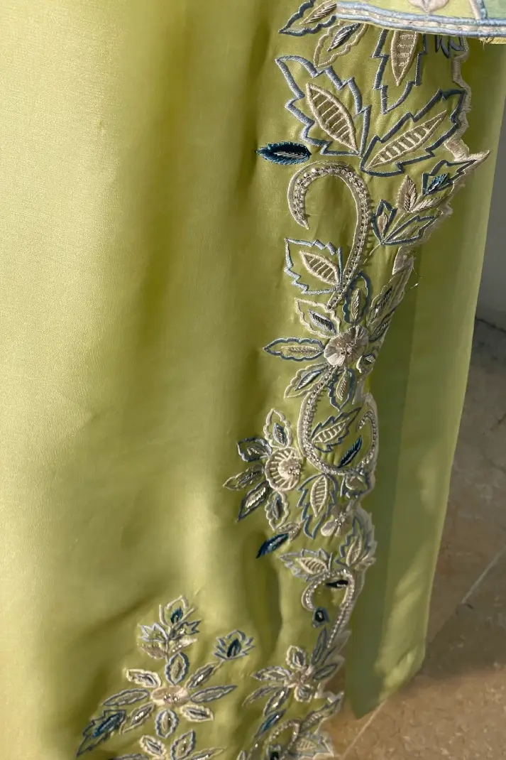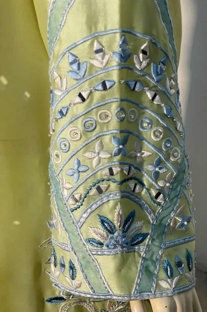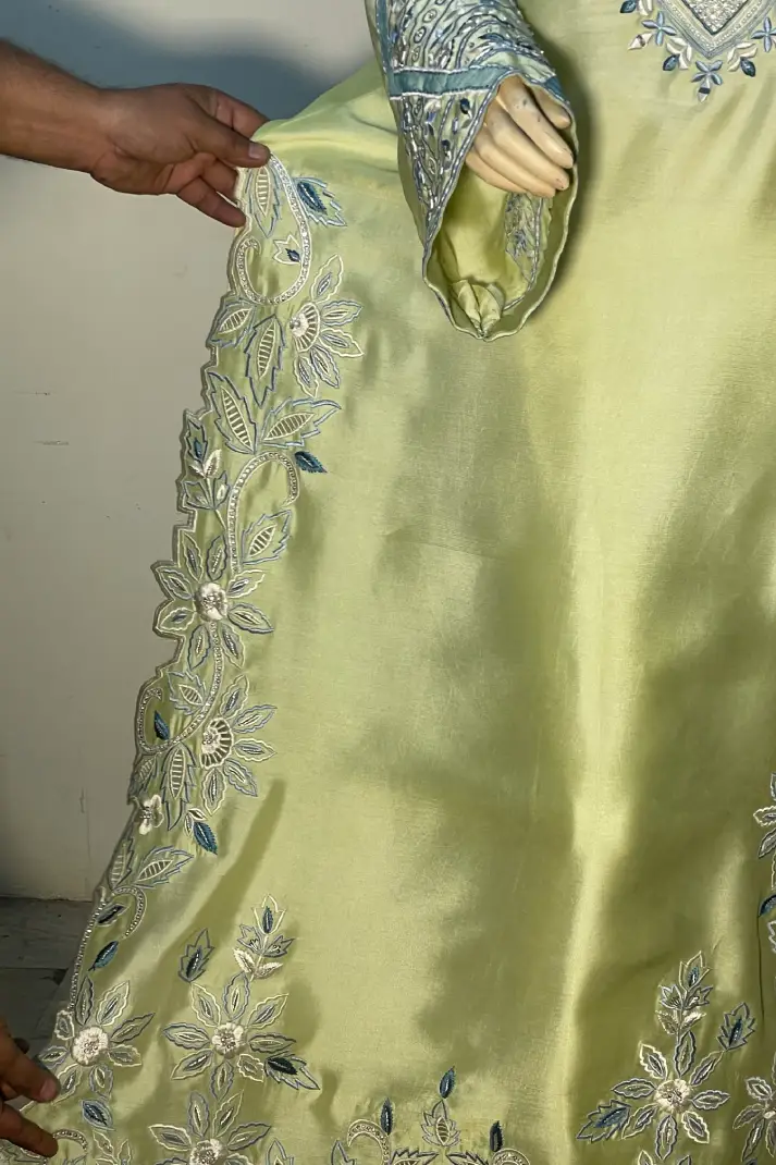 SKU: AZ-30 Color: Light Lime Green Fabric: Shirt and Shalwar: Pure Shisha Silk, Dupatta: Organza/Medium Silk/Chiffon Work Details: Embroidered and Embellished