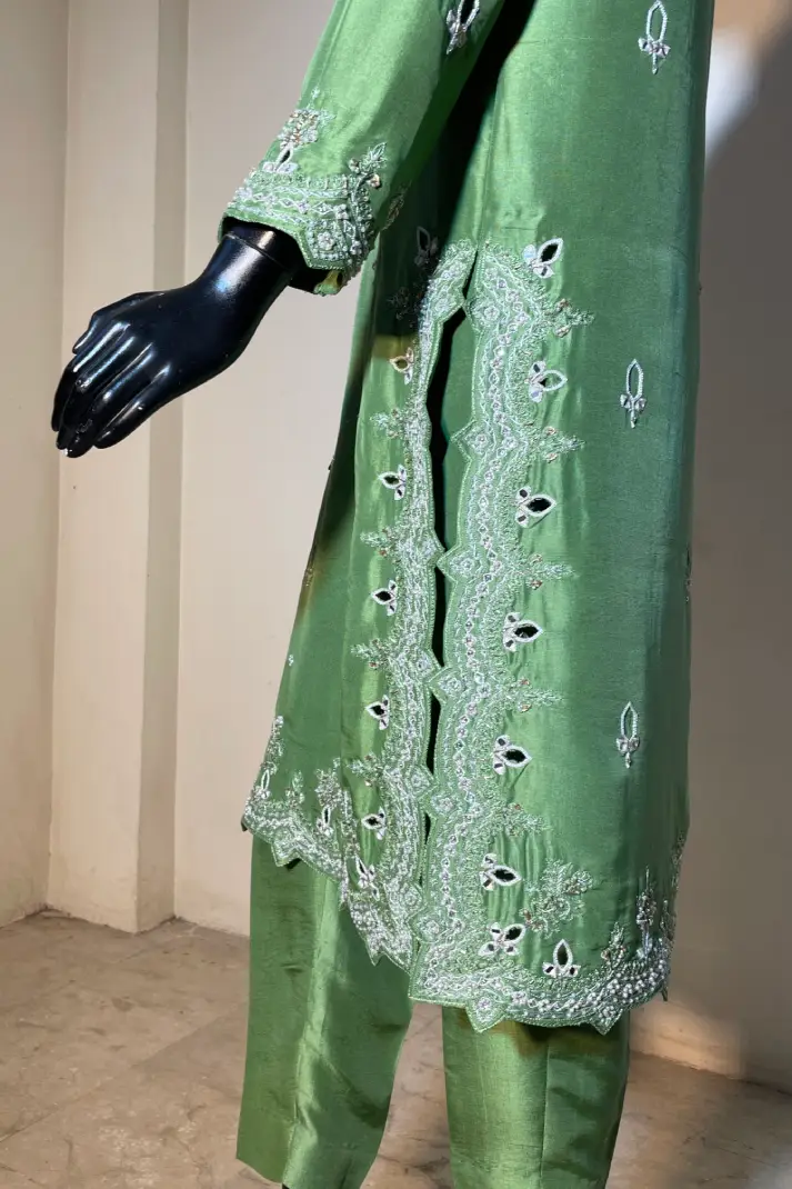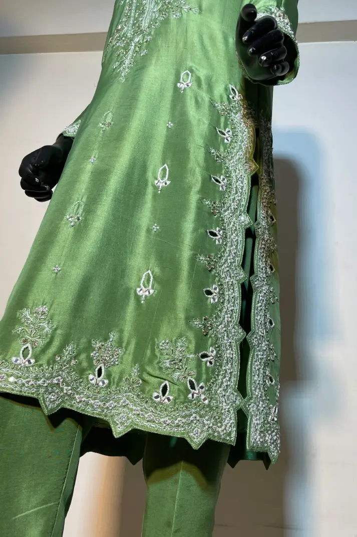 SKU: AZ-34 Color: Lime Green lable>Fabric: Shirt and Shalwar: Pure Shisha Silk, Dupatta: Organza/Medium Silk/Chiffon Work Details: Embroidered and Embellished