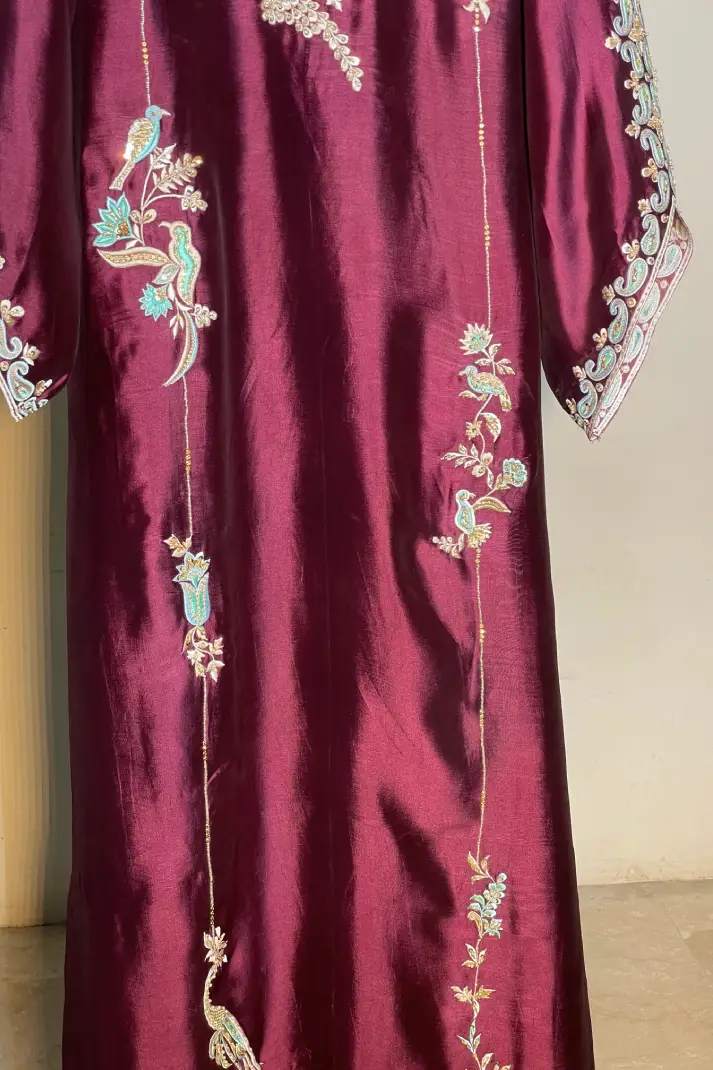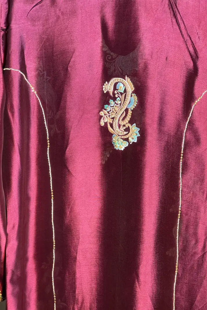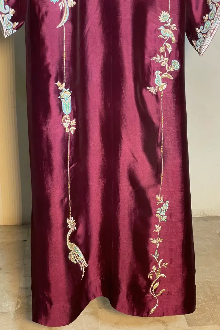 SKU: AZ-35 Color: Plum-Toned Fabric: Shirt and Shalwar: Pure Shisha Silk, Dupatta: Organza/Medium Silk/Chiffon Work Details: Embroidered and Embellished