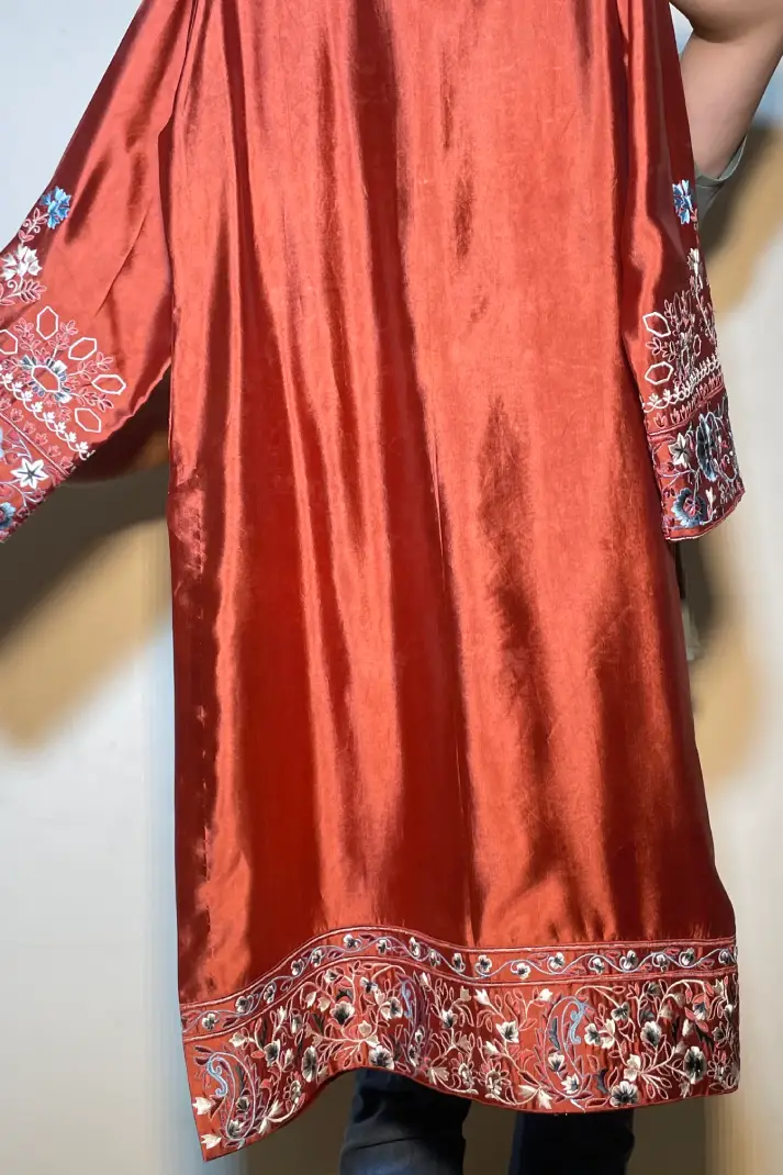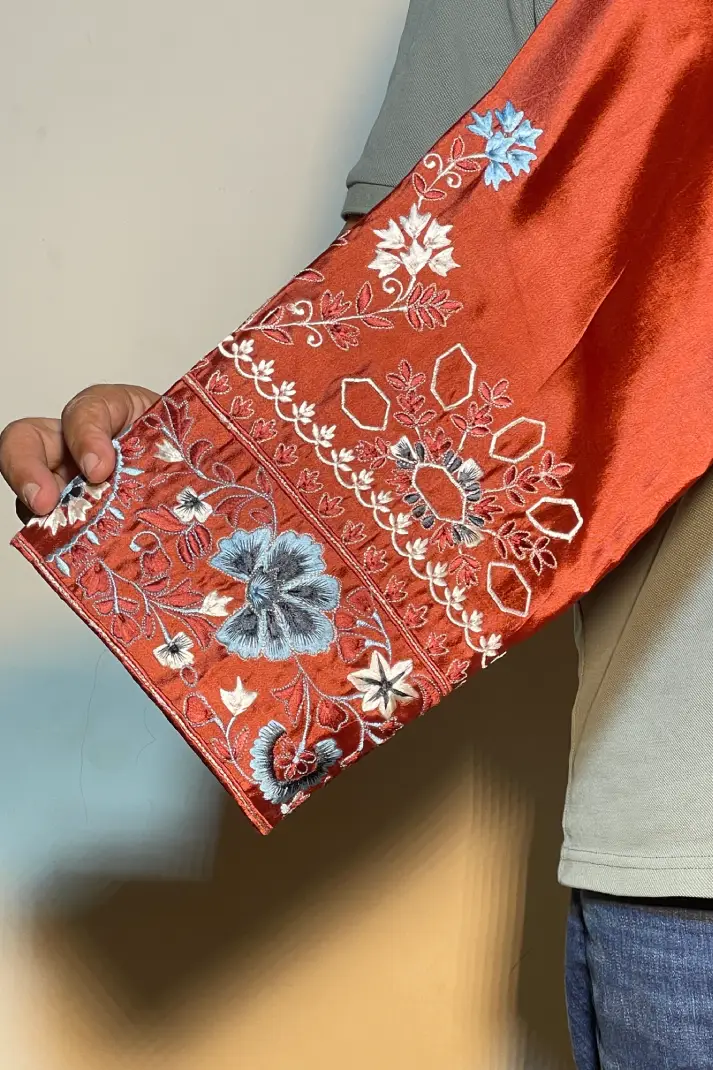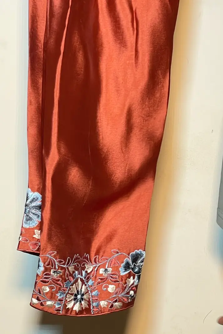 SKU: AZ-42 Color: Rust Red Fabric: Shirt and Shalwar: Pure Shisha Silk, Dupatta: Organza/Medium Silk/Chiffon Work Details: Embroidered