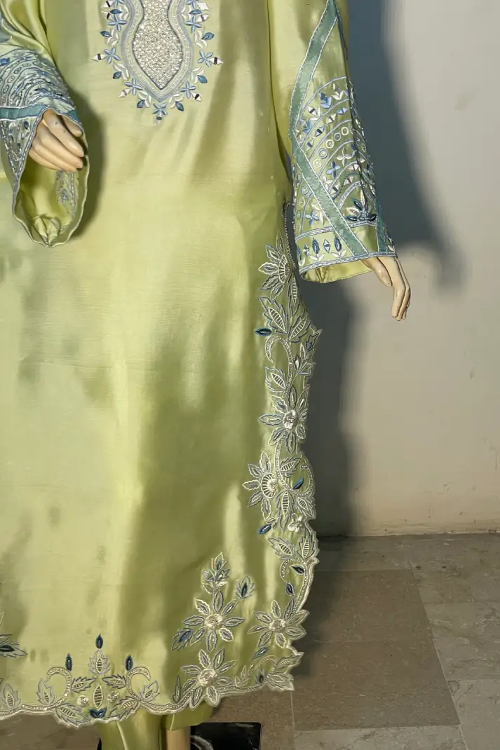 SKU: AZ-30 Color: Light Lime Green Fabric: Shirt and Shalwar: Pure Shisha Silk, Dupatta: Organza/Medium Silk/Chiffon Work Details: Embroidered and Embellished
