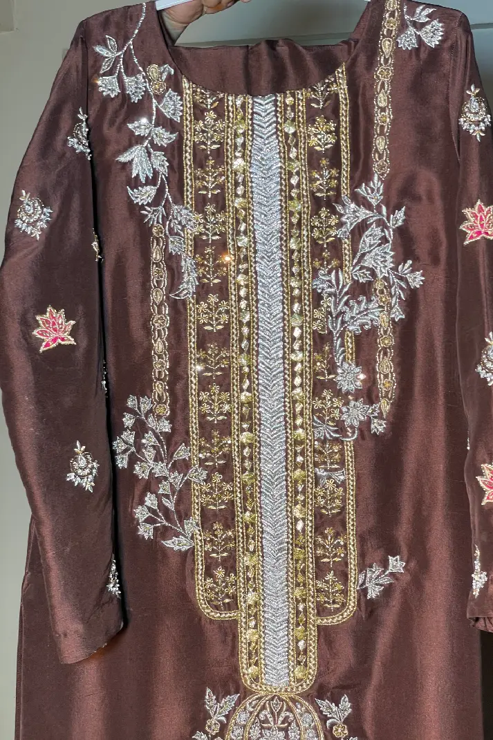 SKU: AZ-32 Color: Chocolate Brown lable>Fabric: Shirt and Shalwar: Pure Shisha Silk, Dupatta: Organza/Medium Silk/Chiffon Work Details: Embroidered and Embellished