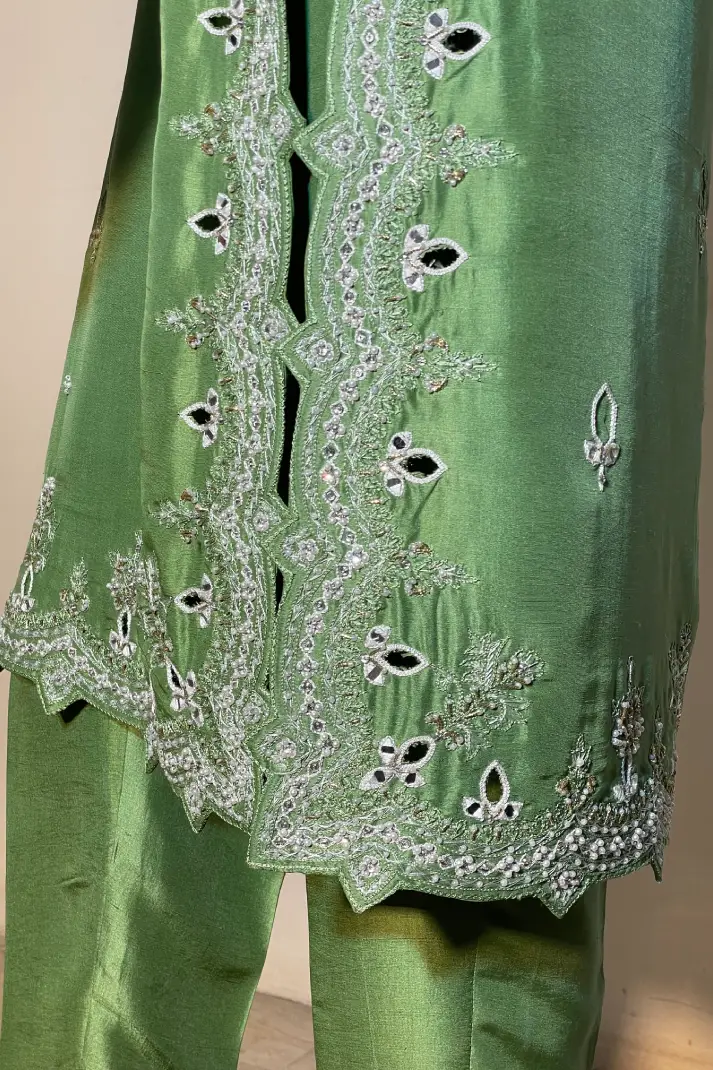 SKU: AZ-34 Color: Lime Green lable>Fabric: Shirt and Shalwar: Pure Shisha Silk, Dupatta: Organza/Medium Silk/Chiffon Work Details: Embroidered and Embellished